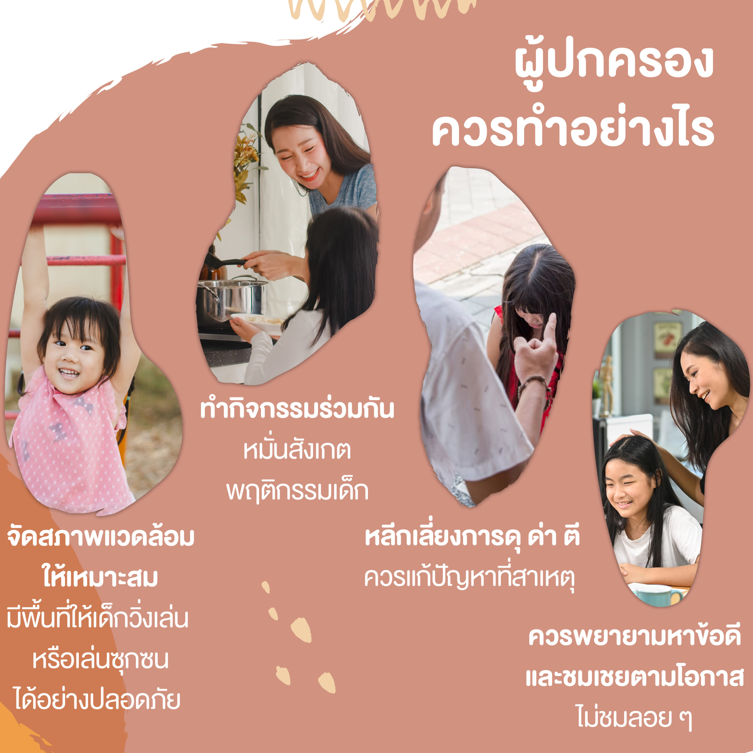 • การจัดสภาพแวดล้อมให้เหมาะสม ในวัยเด็กเล็กควรมีสถานที่ที่เด็กสามารถวิ่งเล่นปีนป่ายได้อย่างอิสระและมีความปลอดภัย ควรจัดเก็บของที่อาจเป็นอันตรายไม่ให้เด็กหยิบมาเล่นได้ ในกรณีเด็กวัยเรียนเมื่อต้องทำกิจกรรมที่ต้องใช้สมาธิ เช่น เรียนออนไลน์ หรือทำการบ้าน เป็นต้น ควรจัดให้เด็กนั่งเรียนหรือทำการบ้านในที่ไม่มีสิ่งเร้ามาคอยกระตุ้นความสนใจ ซึ่งจะทำให้เด็กวอกแวกและเสียสมาธิง่าย อาจเป็นห้องที่เงียบหรือนั่งหันหน้าเข้าหากำแพง
